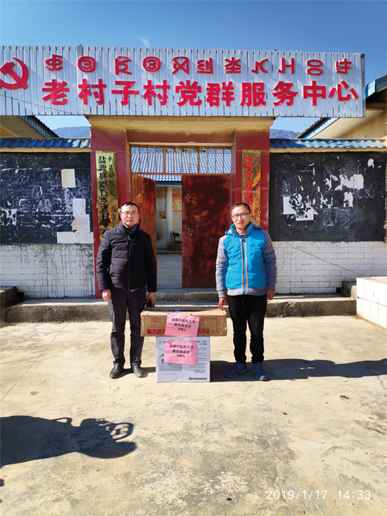 黄立华(左)带来beat365在线唯一官网教育基金会为老村子村捐赠的办公用品