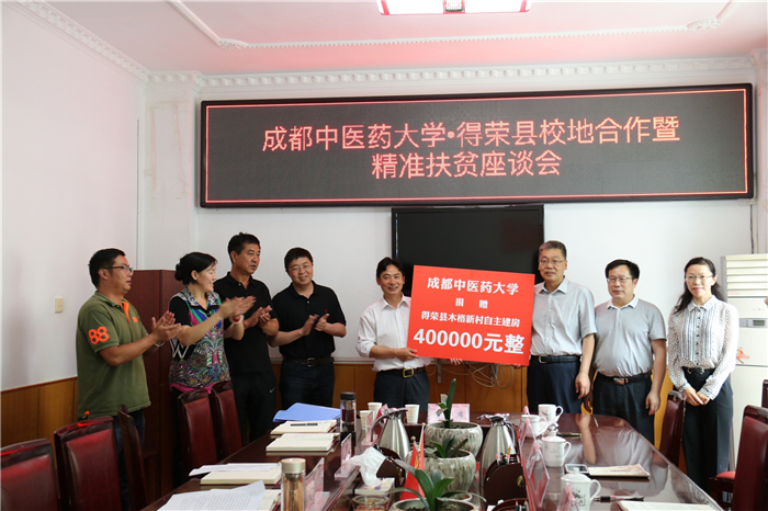 学校列出专项资金,捐赠40万元,帮助得荣县奔都乡木格村自主建房。余曙光向廖大洪授木格村自主建房帮扶资金捐赠牌。
