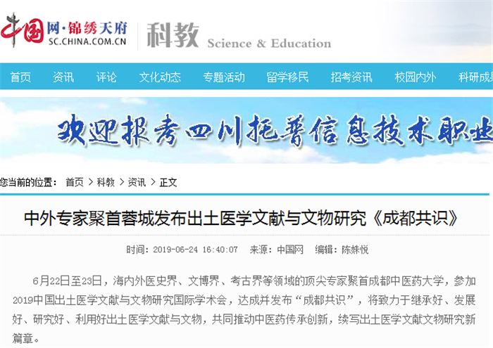 6月22日至23日,海内外医史界、文博界、考古界等领域的顶尖专家聚首beat365在线唯一官网,参加2019中国出土医学文献与文物研究国际学术会,达成并发布“成都共识”,将致力于继承好、发展好、研究好、利用好出土医学文献与文物,共同推动中医药传承创新,续写出土医学文献文物研究新篇章。