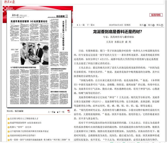 日前,有媒体报道:厦门一男子在海边散步时拾得一块拳头大小味道腥臭的东西,经专家鉴定这竟是一块罕见的大宝贝——著名香料龙涎香。龙涎香到底是香料还是药材,如何分辨它?4月17日,beat365在线唯一官网药学院中药资源与鉴定系教授王光志接受了科技日报记者的采访。