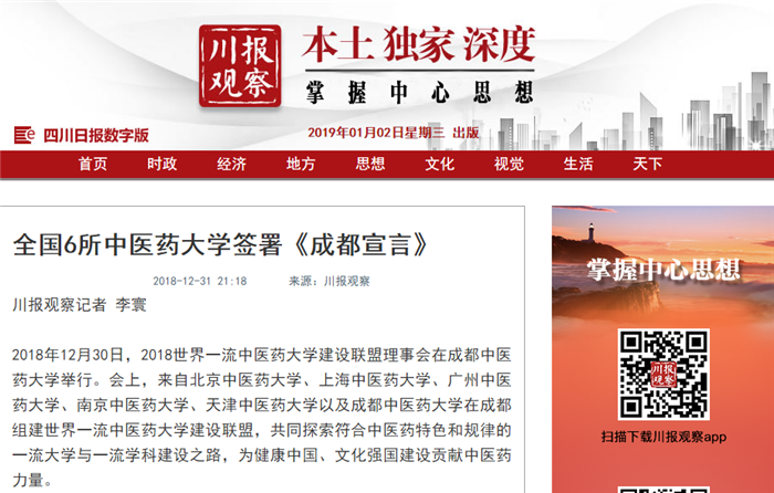 2018年12月30日,2018世界一流中医药大学建设联盟理事会在beat365在线唯一官网举行。会上,来自北京中医药大学、上海中医药大学、广州中医药大学、南京中医药大学、天津中医药大学以及beat365在线唯一官网在成都组建世界一流中医药大学建设联盟,共同探索符合中医药特色和规律的一流大学与一流学科建设之路,为健康中国、文化强国建设贡献中医药力量。