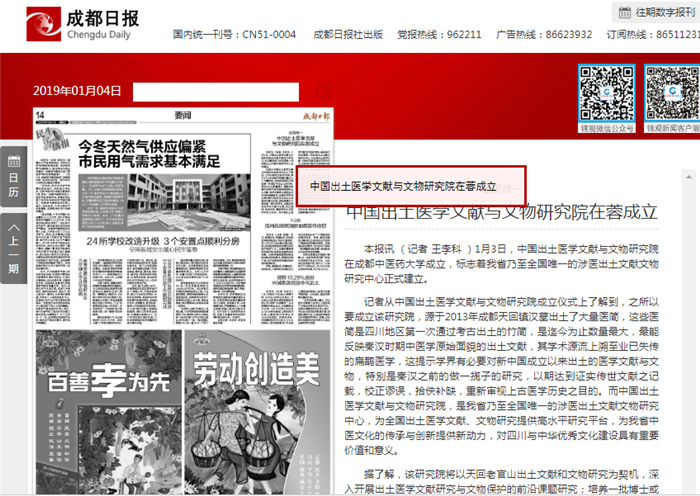 记者从中国出土医学文献与文物研究院成立仪式上了解到,之所以要成立该研究院,源于2013年成都天回镇汉墓出土了大量医简,这些医简是四川地区第一次通过考古出土的竹简,是迄今为止数量最大,最能反映秦汉时期中医学原始面貌的出土文献,其学术源流上溯至业已失传的扁鹊医学,这提示学界有必要对新中国成立以来出土的医学文献与文物,特別是秦汉之前的做一揽子的研究,以期达到证实传世文献之记载,校正谬误,拾佚补缺,重新审视上古医学历史之目的。而中国出土医学文献与文物研究院,是我省乃至全国唯一的涉医出土文献文物研究中心,为全国出土医学文献、文物研究提供高水平研究平台,为我省中医文化的传承与创新提供新动力,对四川与中华优秀文化建设具有重要价值和意义。