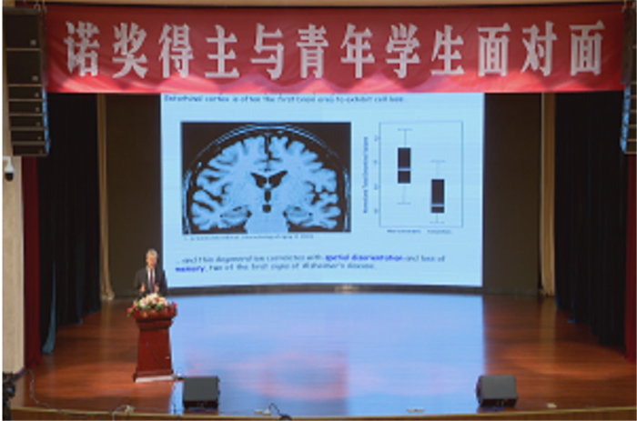 爱德华.莫泽教授认为,网格细胞的损伤导致空间定向障碍和记忆丧失,符合阿尔茨海默病的最初迹象,因此掌握关于青少年和老年啮齿动物的空间和记忆的最新研究知识有助于了解和治疗阿尔茨海默病。其幽默风趣的语言引得现场阵阵掌声。