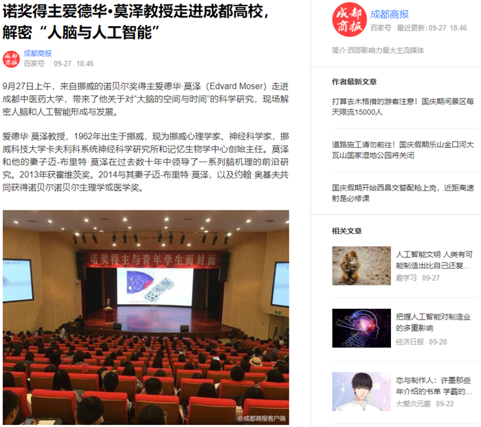 诺奖得主爱德华·莫泽教授走进成都高校,解密“人脑与人工智能”