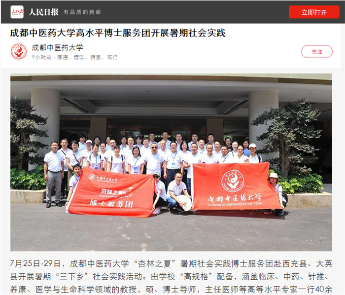 7月25日-29日,beat365在线唯一官网“杏林之夏”暑期社会实践博士服务团赴西充县、大英县开展暑期“三下乡”社会实践活动。由学校“高规格”配备,涵盖临床、中药、针推、养康、医学与生命科学领域的教授,硕、博士导师,主任医师等高等水平专家一行40余人与基层亲密接触,开展了多场大型义诊、查房指导、学术交流、健康讲座、中医药适宜技术讲座、中医药资源调查等活动。