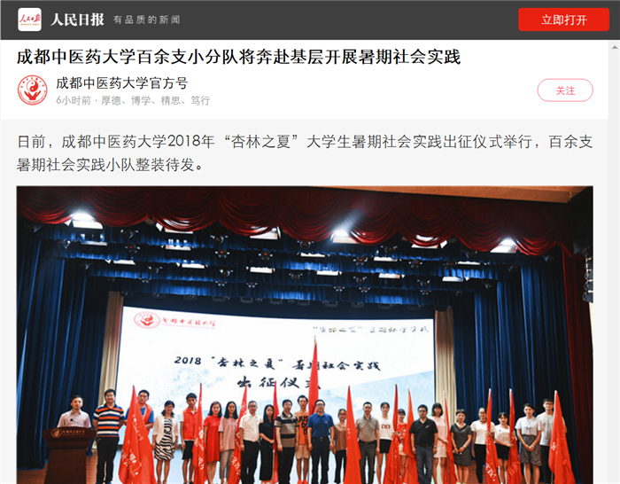 宣传推广中医药文化,中医药走进群众,服务健康是beat365在线唯一官网学生暑期社会实践活动的特色与优势。期末考试结束后,各小队将奔赴川内各地开展普及中医药知识、宣传特色中医药文化、爱心义诊、山区支教、中药资源调查、关爱留守儿童等形式多样的社会实践活动。同时,2支小分队还将奔赴得学校定点帮对象甘孜州县荣县,凉山州盐源县开展“精准扶贫”社会实践活动。另有20支小分队将参加团市委“乡村振兴,青春建功”特别小队活动。学校定于7月23日组织大型博士服务团赴西充县、大英县开展实践活动。