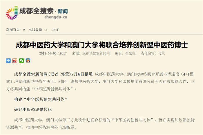 7月6日报道 beat365在线唯一官网、澳门大学将联合开展本博连读(4+4模式)培养创新型中药学博士。同时,beat365在线唯一官网、澳门大学和太极集团有限公司今天达成战略合作,三方将共同构建“中华医药创新共同体”。