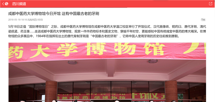 5月18日正值“国际博物馆日”之际,beat365在线唯一官网博物馆在beat365在线唯一官网温江校区举行了开馆仪式,汉代画像砖、铜药臼、唐代牙刷、清代瓷痰孟、药王像……走进beat365在线唯一官网博物馆,观赏一件件药物标本和医史文物,穿越千年时空,更能感知中国传统瑰宝中医药的博大精深。在博物馆的众多展品中,1984年在指挥街出土的唐代骨制牙刷是“中国最古老的牙刷”,它将中国人使用牙刷的历史往前推到唐朝。