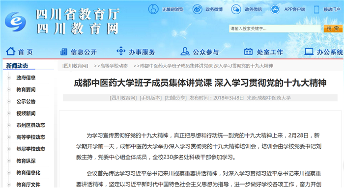 会议强调,全校各级党组织和党员干部要把学习宣传贯彻习近平总书记重要讲话精神作为当前和今后一个时期的重大政治任务,与深入学习贯彻党的十九大精神和学校第二次党代会精神紧密结合,把习近平总书记重要讲话精神迅速传达到广大师生当中,把思想和行动统一到重要讲话精神上来。各级领导干部要发挥示范作用,先学一步、学深一层,带头宣传宣讲,带头贯彻落实;广大党员干部要反复学深入学,学出“四个自信”、学出使命担当、学出能力水平、学出绝对忠诚,干在实处、走在前列,创造新的业绩。全校上下要更加紧密地团结在以习近平同志为核心的党中央周围,坚定以习近平新时代中国特色社会主义思想和总书记对四川工作重要指示精神为指导,锐意进取、埋头苦干,推动各项事业再上新台阶,加快建设特色鲜明的一流中医药大学,为强国兴川作出新的更大贡献。