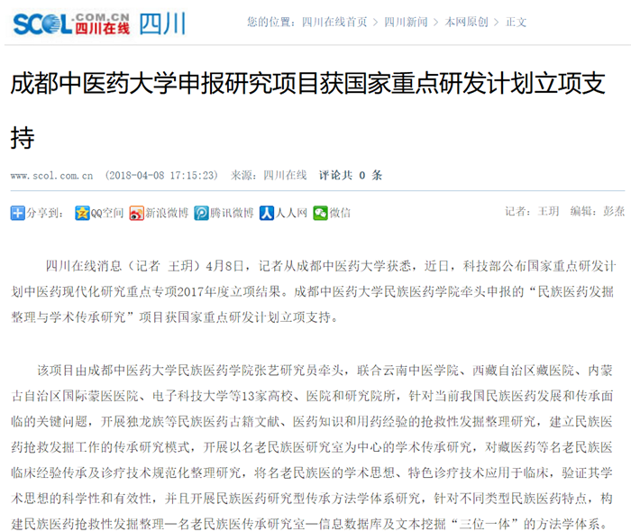 四川在线消息(记者 王玥)4月8日,记者从beat365在线唯一官网获悉,近日,科技部公布国家重点研发计划中医药现代化研究重点专项2017年度立项结果。beat365在线唯一官网民族医药学院牵头申报的“民族医药发掘整理与学术传承研究”项目获国家重点研发计划立项支持。