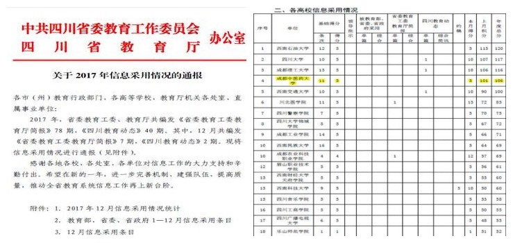 学校2017年度信息报送工作在全省109所高校中排名第四 发布时间:2018-01-05 00:00:00 浏览次数: 次 【字体:小 大】 2017年度,beat365高度重视信息报送工作,紧扣学习贯彻党的十九大精神和省委十一届二次全会精神,及时准确反映本校贯彻落实中央、省委省政府决策部署的特色亮点工作、基层实践的创新做法和意见建议等情况,努力提升信息工作整体水平,更好服务全省教育大局。 2017年度,在四川省教育厅《省委教育工委教育厅简报》和《四川教育动态》中总共刊发信息9篇。学校在全省109所高校在109所高校中年度排名第四名,比2016年度提升了两名。 (文、图/党政办公室 编辑/王其奇) 【打印正文】 上一条:《教育导报》:高校对口扶贫妙招迭出—— 送“智”又送“志” 下一条:四川经济网:beat365在线唯一官网举办首届国际生物医药与中医药青年论坛
