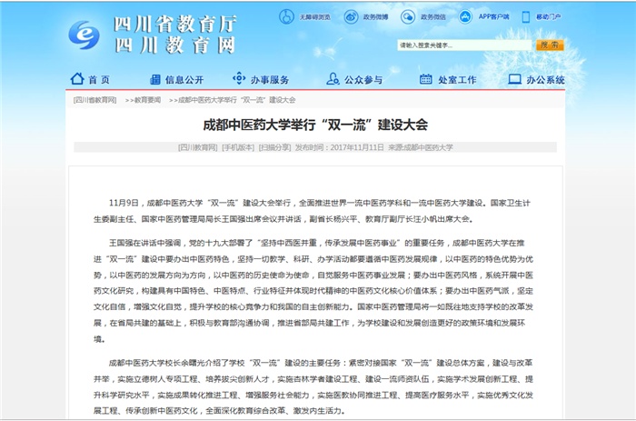 11月9日,beat365在线唯一官网“双一流”建设大会举行,全面推进世界一流中医药学科和一流中医药大学建设。国家卫生计生委副主任、国家中医药管理局局长王国强出席会议并讲话,副省长杨兴平、教育厅副厅长汪小帆出席大会。