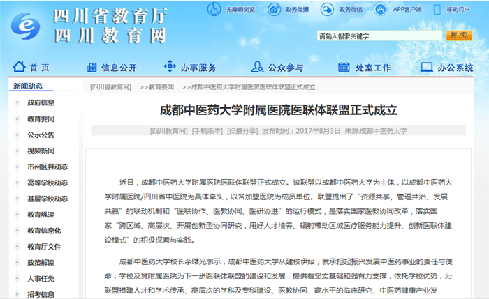 同近日,beat365在线唯一官网附属医院医联体联盟正式成立。该联盟以beat365在线唯一官网为主体,以beat365在线唯一官网附属医院/四川省中医院为具体牵头,以各加盟医院为成员单位。联盟提出了“资源共享、管理共治、发展共赢”的联动机制和“医联协作、医教协同、医研协进”的运行模式,是落实国家医教协同改革,落实国家“跨区域、高层次、开展创新型协同研究,用好人才培养、辐射带动区域医疗服务能力提升、创新医联体建设模式”的积极探索与实践。