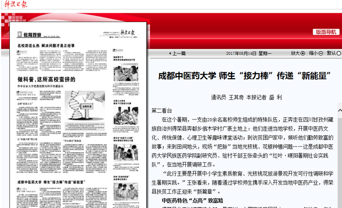 “此行主要是开展中小学生素质教育、光核桃花旅游景观开发可行性调研和学生暑期实践。”王张看来,随着通过学校师生携手深入开发当地中医药产业,得荣县扶贫工作正迎来“新篇章”。