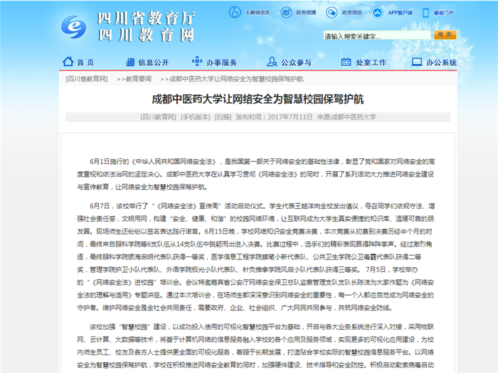 6月7日,该校举行了“《网络安全法》宣传周”活动启动仪式。学生代表王越洋向全校发出倡议,号召同学们依规守法、增强社会责任感,文明用网,构建“安全、健康、和谐”的校园网络环境,让互联网成为大学生真实便捷的知识库、温暖可靠的朋友圈。现场师生还纷纷以签名表达践行诺言。6月15日晚,学校网络知识安全竞赛决赛,本次竞赛从初赛到决赛历经半个月的时间,最终来自眼科学院等6支队伍从14支队伍中脱颖而出进入决赛。比赛过程中,选手们的精彩表现赢得阵阵掌声。经过激烈角逐,最终眼科学院银海启明代表队获得一等奖,医学信息工程学院蜡笔小新代表队、公共卫生学院公卫毒霸代表队获得二等奖,管理学院护卫小队代表队、外语学院极光小队代表队、针灸推拿学院风启小队代表队获得三等奖。 7月5日,学校举办的“《网络安全法》进校园”培训会。会议特邀嘉宾省公安厅网络安全保卫总队监察管理支队支队长陈洁为大家作题为《网络安全法的理解与适用》专题讲座。通过本次培训会,在场师生都深深意识到网络安全的重要性,每一个人都应自觉成为网络安全的守护者。维护网络安全是全社会共同责任,需要政府、企业、社会组织、广大网民共同参与,共筑网络安全防线。