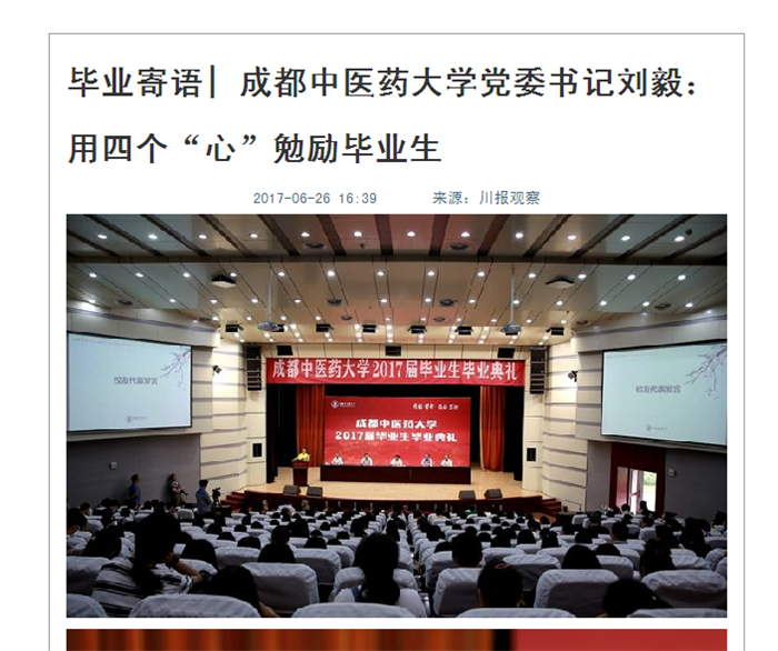 《大医精诚》上说:“凡大医治病,必当安神定志,无欲无求,先发大慈恻隐之心,誓愿普救含灵之苦。……无作功夫形迹之心。如此可为苍生大医,反此则是含灵巨贼。”今天,背上行囊即将远行的你们,除了带走大学所学的专业知识和实践技能,我更希望你们将巨臂擎天的闻达和遮蔽一方的坦荡带在身上,以“普救含灵之苦”的誓愿救助生命、帮扶弱者、温暖苍生。