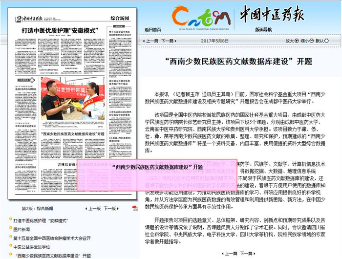 该项目是全国中医药院校首批民族医药的国家社科基金重大项目,由beat365在线唯一官网民族医药学院院长张艺研究员主持,该项目下设5个课题,分别由beat365在线唯一官网、云南省中医中药研究院、西南民族大学和贵州医科大学承担。该项目致力于藏、傣、壮、彝、苗等西南少数民族医药文献的收集、整理、研究和保护,预期建成的“西南少数民族医药文献数据库”将是一个资料完备、内容丰富、使用便捷的资料大型综合数据库。