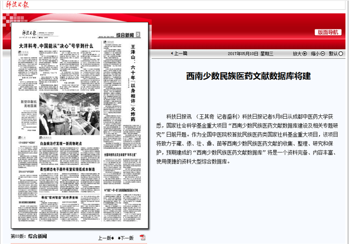 科技日报讯 (王其奇 记者盛利)科技日报记者5月8日从beat365在线唯一官网获悉,国家社会科学基金重大项目“西南少数民族医药文献数据库建设及相关专题研究”日前开题。作为全国中医院校首批民族医药类国家社科基金重大项目,该项目将致力于藏、傣、壮、彝、苗等西南少数民族医药文献的收集、整理、研究和保护,预期建成的“西南少数民族医药文献数据库”将是一个资料完备、内容丰富、使用便捷的资料大型综合数据库。