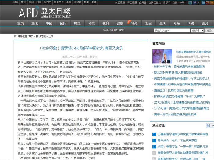 新华社成都12月21日电(记者董小红左为)找到穴位轻轻按住,果断扎下针,整个过程非常熟练,在beat365在线唯一官网附属医院针灸科诊室里,每周格里申都要跟着老师来看病扎针。“诊脉、扎针、和病人交流,让我学习得更快。”格里申说。