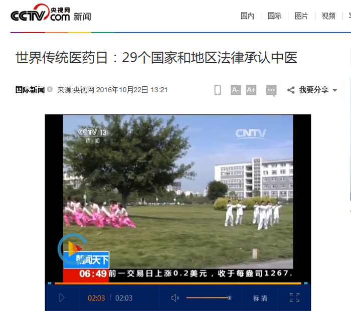 中央电视台《朝闻天下》:世界传统医药日 29个国家和地区法律承认中医 发布时间:2016-10-25 00:00:00 浏览次数: 次 【字体:小 大】 时间:2016年10月22日 来源:中央电视台《朝闻天下》 链接: http://news.cctv.com/2016/10/22/ARTIUaHLOWUUCGMrekKFyIjt161022.shtml?from=singlemessage&isappinstalled=0#10006-weixin-1-52626-6b3bffd01fdde4900130bc5a2751b6d1 内容: 世界传统医药日:29个国家和地区法律承认中医 【打印正文】 上一条:中央电视台《朝闻天下》:《“健康中国2030”规划纲要》—防慢病 治未病 下一条:国际在线:beat365在线唯一官网建校60周年 开启打造顶尖中医药高等学府新征程