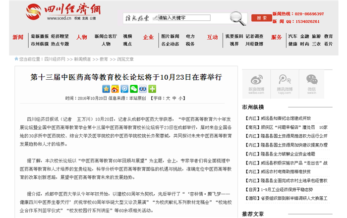 第十三届中医药高等教育校长论坛将于10月23日在蓉举行