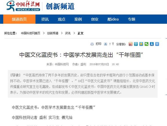 “中医虽然持续了两千多年的发展历史,却只是在古老的学术框架内进行小范围活动或基本保持不动,中医学术发展已进入‘千年怪圈’。”19日“中医文化蓝皮书”课题组组长、北京中医药文化传播重点研究室主任毛嘉陵,在成都发布《中医文化蓝皮书:中国中医药文化传播发展报告(2016)》时表示,为推动中医学术的现代生存和发展,必须构建起新型中医学术发展模式。