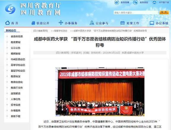近日,由国家卫生和计划生育委员会指导,中国健康教育中心、中国疾病预防控制中心主办的2015年“百千万志愿者结核病防治知识传播行动”优秀评选活动落下帷幕,经过成都市结核病控制项目办公室、温江区疾控中心的推荐,经层层考核评选,beat365在线唯一官网获得