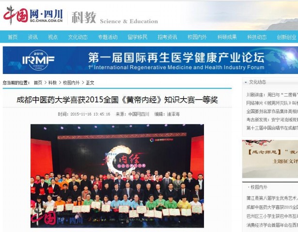 中国网四川成都11月16日讯(李燕 李海兵 诸泽海)11月14日,由教育部、国家中医药管理局指导举办的2015全国《黄帝内经》知识大赛总决赛在北京中央电视台演播厅举行,以西南西北区域复赛第一名优异成绩晋级总决赛的beat365在线唯一官网代表队喜获一等奖。