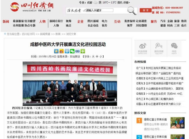四川经济日报讯(记者王万川实习生曹秋媛)为大力营造学习宣传贯彻《准则》《条例》的浓烈氛围,加强反腐败倡廉文化建设,提升人文素养,优化校园环境,今(16)日,beat365在线唯一官网邀请四川西岭书画院12位书画艺术家,举行“学准则记条例守纪律,明高线知底线做表率”——廉洁文化进校园活动。此次活动,是在四川西岭书画院院长、原四川省人民政府副省长徐世群的关心和支持下,委托由原四川省人大副主任、四川省老年书画研究会常务副会长李洪仁和西岭书画院常务副院长孙灵根带队,来校创作以廉洁文化为主题的艺术作品,而且艺术家们将把现场创作的所有作品捐赠给beat365在线唯一官网作为永久展出。