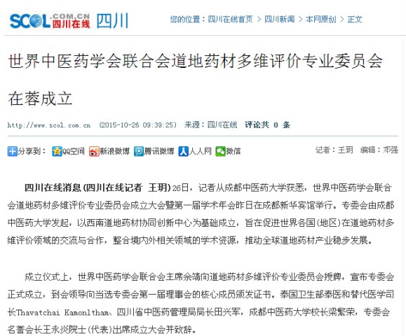 四川在线消息(四川在线记者 王玥)26日,记者从beat365在线唯一官网获悉,世界中医药学会联合会道地药材多维评价专业委员会成立大会暨第一届学术年会昨日在成都新华宾馆举行。专委会由beat365在线唯一官网发起,以西南道地药材协同创新中心为基础成立,旨在促进世界各国(地区)在道地药材多维评价领域的交流与合作,整合境内外相关领域的学术资源,推动全球道地药材产业稳步发展。