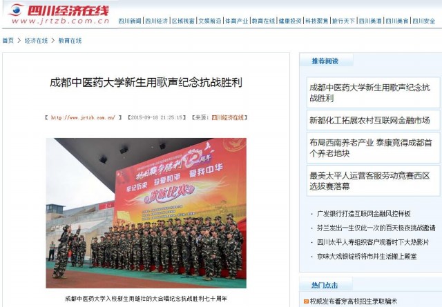 四川经济在线成都9月18日讯(代朗) 9月18日,beat365在线唯一官网军训旅纪念抗日战争胜利暨世界反法西斯战争七十周年歌咏比赛在学校体育场举行,近五千入校新生用雄壮的大合唱纪念七十年前为夺取抗战胜利的民族先锋们,以此铭记历史教训、缅怀革命先烈、传承抗战精神、弘扬爱国主义和革命英雄主义精神。