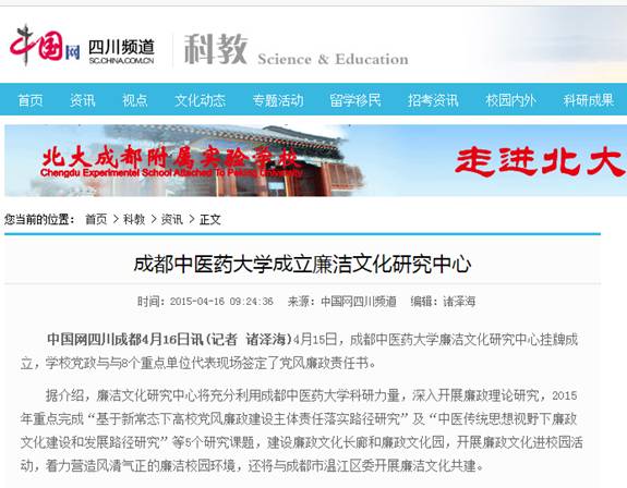 据介绍,廉洁文化研究中心将充分利用beat365在线唯一官网科研力量,深入开展廉政理论研究,2015年重点完成“基于新常态下高校党风廉政建设主体责任落实路径研究”及“中医传统思想视野下廉政文化建设和发展路径研究”等5个研究课题,建设廉政文化长廊和廉政文化园,开展廉政文化进校园活动,着力营造风清气正的廉洁校园环境,还将与成都市温江区委开展廉洁文化共建。