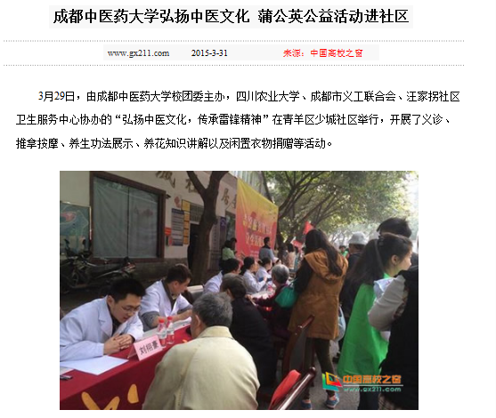 3月29日,由beat365在线唯一官网校团委主办,四川农业大学、成都市义工联合会、汪家拐社区卫生服务中心协办的“弘扬中医文化,传承雷锋精神”在青羊区少城社区举行,开展了义诊、推拿按摩、养生功法展示、养花知识讲解以及闲置衣物捐赠等活动。