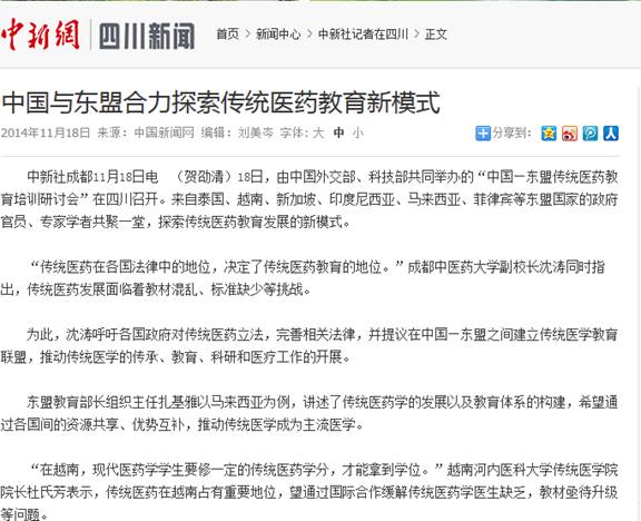 中新社成都11月18日电 (贺劭清)18日,由中国外交部、科技部共同举办的“中国—东盟传统医药教育培训研讨会”在四川召开。来自泰国、越南、新加坡、印度尼西亚、马来西亚、菲律宾等东盟国家的政府官员、专家学者共聚一堂,探索传统医药教育发展的新模式。