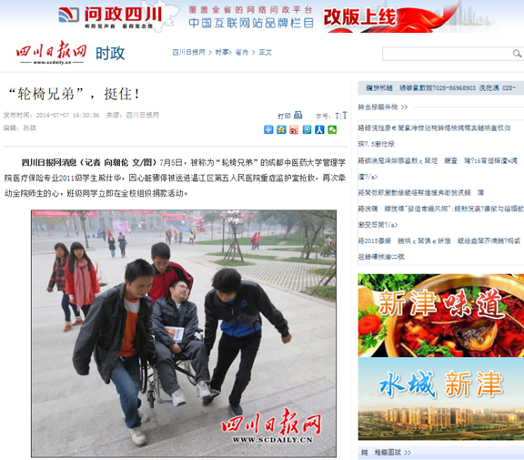 来自万源市的熊仕华、熊仕渊兄弟,都患上了一种双腿无力、至今都没能查出原因的疾病,兄弟俩被鉴定为一级残疾,学习、生活完全离不开轮椅,2011年,备受社会关注的“轮椅兄弟”熊仕华考进成都中医大,熊仕渊也考入四川文理学院。成都中医大管理学院为熊仕华及其陪护家属进行妥善安排,医疗保险专业2011级的同学们更似他们的兄弟姐妹。每天,男生们总是早早到寝室接熊仕华去上课,抬着轮椅上下教学楼,不让他落下一节课,几年如一日、风雨无阻,成了校园一道独特的风景;女生们也尽力关心帮助照顾熊仕华及其家人的日常生活。