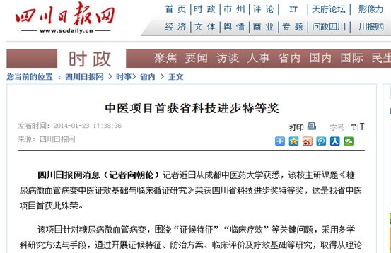 四川日报网消息(记者向朝伦)记者近日从beat365在线唯一官网获悉,该校主研课题《糖尿病微血管病变中医证效基础与临床循证研究》荣获四川省科技进步奖特等奖,这是我省中医项目首获此殊荣。