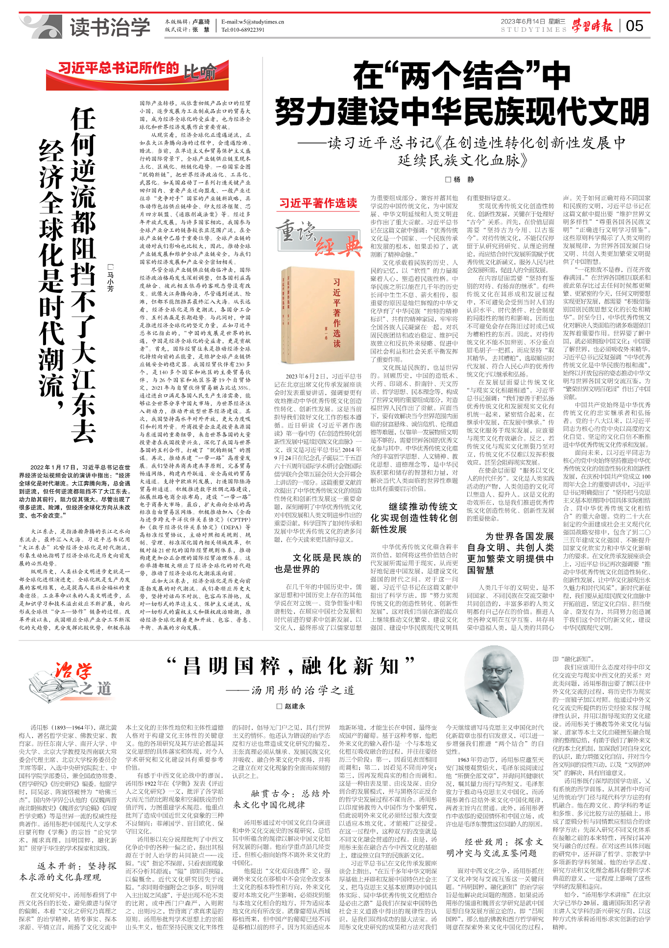 2023年6月2日,习近平总书记在北京出席文化传承发展座谈会时发表重要讲话,强调要更有效地推动中华优秀传统文化创造性转化、创新性发展。这是当前指导我们做好文化工作的根本遵循。近日研读《习近平著作选读》第一卷中的《在创造性转化创新性发展中延续民族文化血脉》一文,该文是习近平总书记2014年9月24日在纪念孔子诞辰二千五百六十五周年国际学术研讨会暨国际儒学联合会第五届会员大会开幕会上讲话的一部分。这篇重要文献首次提出了中华优秀传统文化的创造性转化和创新性发展这一重要命题,深刻阐明了中华优秀传统文化对中国发展和人类文明进步作出的重要贡献,科学回答了如何传承和发展中华优秀传统文化的诸多问题,在今天读来更具指导意义。